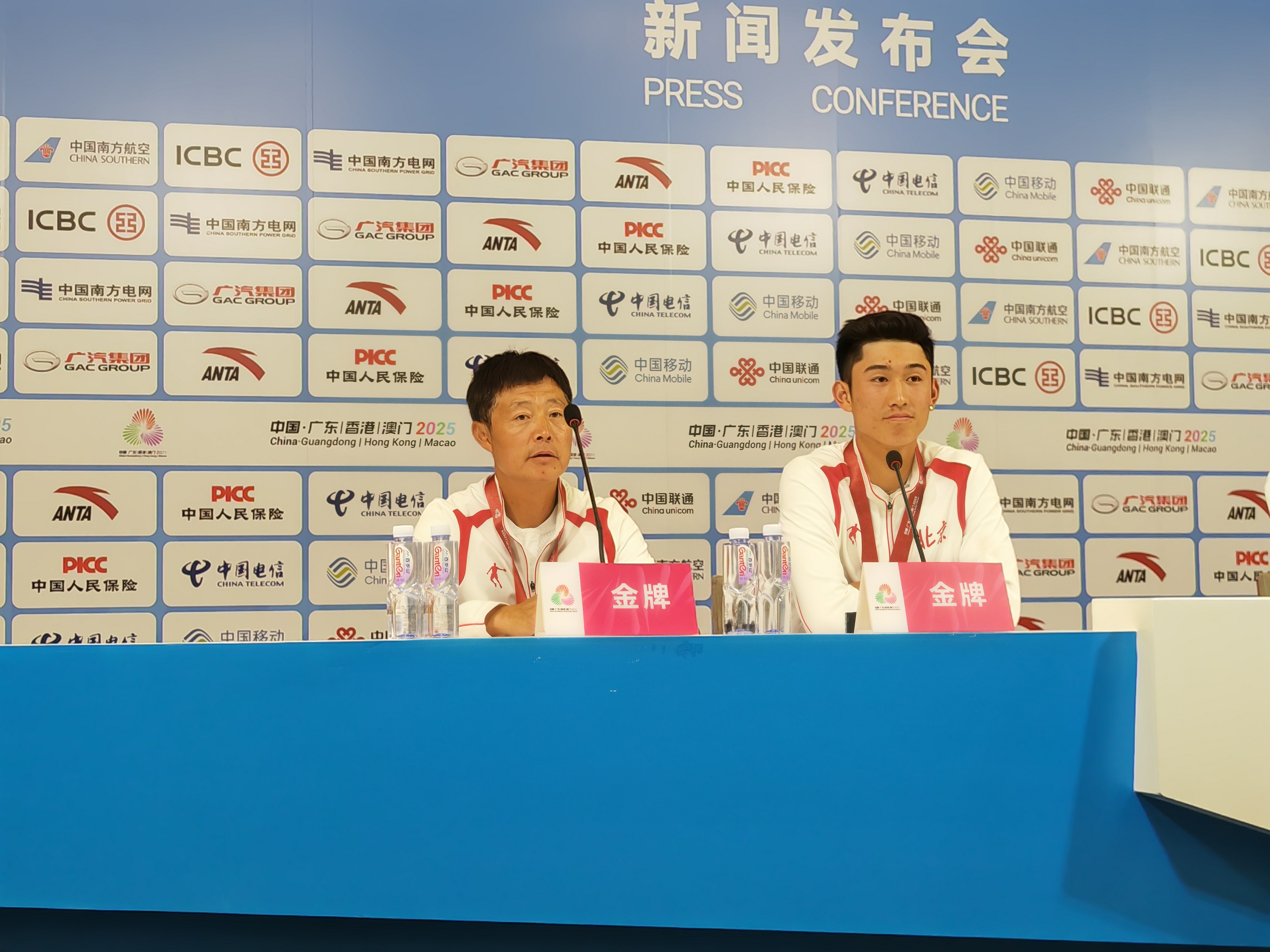 11月12日,北京队运动员商竣程(右)和教练田天在新闻发布会上。新华社记者 乐文婉 摄